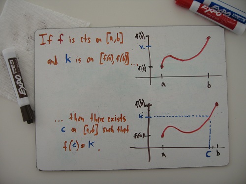 So I was perfectly confident when I allotted one day for the Intermediate Value Theorem. The IVT captures a perfectly obvious idea: If at one time you’re 4 feet tall, and later on you’re 6 feet tall, then at some point in between you must be 5 feet tall. In other words: if you reach two different values (e.g., 4 and 6), you must also reach any “intermediate value” between them (e.g., 5, or 4.2, or 5.97).