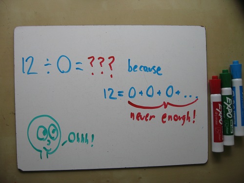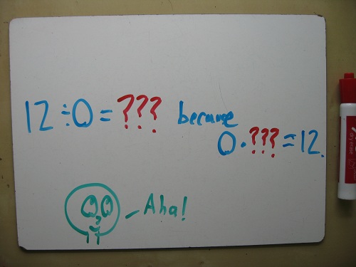 While she was washing dishes, I asked my fiancee why you can’t divide by zero. Her off-the-top-of-her-head answer was more concise than mine. (In my defense, I get the dishes cleaner than she does.)