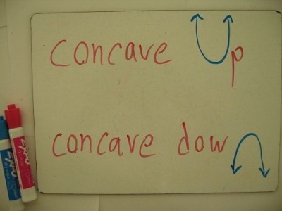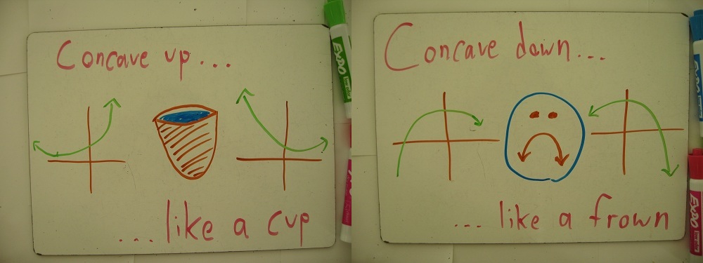 I always got them backwards, they way that I thought of it was concave up meant it looks like an arrow head pointing up, concave down meant it looked like an arrow head pointing down, however, then I’d have to remember that it is the opposite of what I normally would think. Now, I just remember concave up = positive 2nd derivative, concave down = negative 2nd derivative.