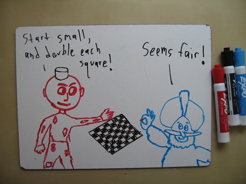 1. There’s a great kid’s book about this! It’s called One Grain of Rice and it tells basically the same story of the sultan and the beggar (the raja and a girl this time). It has awesome illustrations–on the first day, a bird brings the girl a grain of rice, and by the 30th day, hundreds of elephants deliver all the rice in the kingdom. I read it with first graders last year!