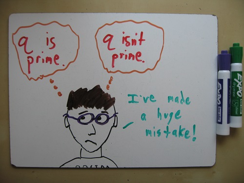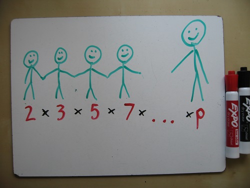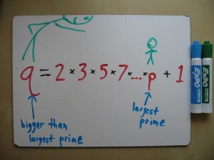 1. The version of this proof that I’ve heard is not the contradiction about whether p is really prime or not, but the contradiction about whether p is really largest or not. This way, Dan’s observation is really helpful. If you multiply all the primes 1 through p and add 1, you get a number q that’s definitely bigger than p and not divisible by any number less than or equal to p (try it with Dan’s numbers — 30031 is not prime, but it’s not divisible by 2, 3, 5, 7, 11, or 13 either). Either q is prime, in which case p is NOT the largest prime, or q is composite, in which case it has at least two prime factors… BOTH of which must be greater than p. So there can’t exist any such largest prime.