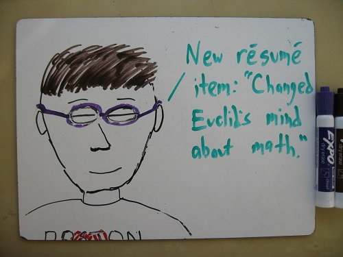 So it’s not Euclid who’s being silly. It’s me. (Or the poem version of me, anyway.) Euclid only PRETENDS to agree with me to reveal my silliness.