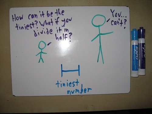 “C’mon,” I said. “What if you take your little number, and divide it by two? Dividing it by two should make it smaller. But you said it’s already the smallest.”