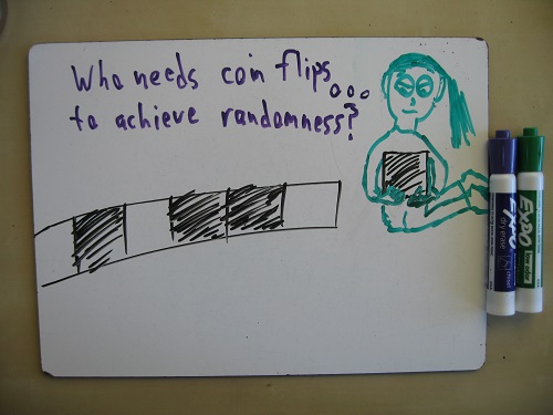 “Before you place each rock, flip a coin,” the teacher said. “If it comes up heads, place a white rock; if tails, place a black rock. That way, the sequence will be truly random, like nature.”