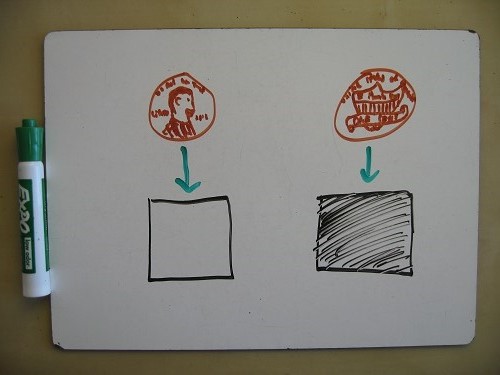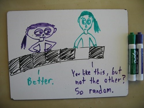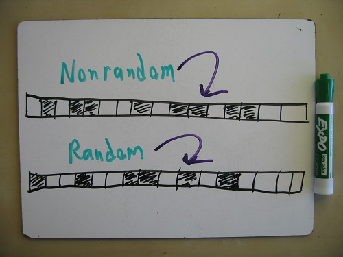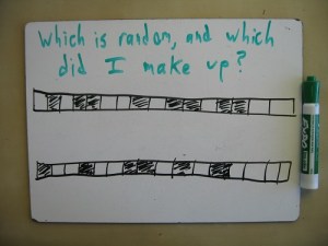 Nosey Practical Advice: I think that there could be more brick wall drawings that would illustrate the point a little better, without making things any more technical. Let’s say a great big wall, 30 bricks wide by 20 bricks high, that the teacher zooms in on and shows runs of 5 or 10 blocks of the same color, but the teacher cannot find any such runs in the student wall.