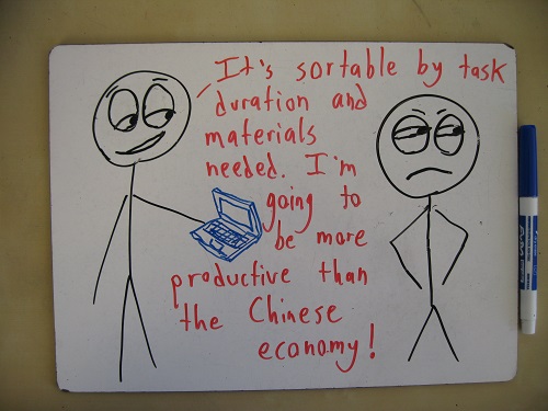 1. I don’t know whether I should be ashamed or proud of myself that I have actually written “Write to-do list” as the first item on some of my to-do lists. It does help to make me look almost as productive as the Chinese economy. 🙂