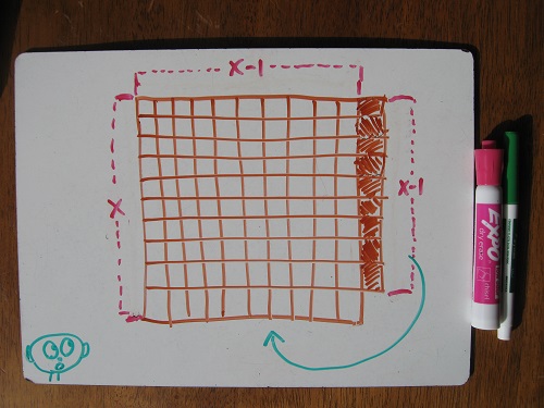 From time to time, the formula and my “discovery” drifted back into my thoughts, like an old phone number or a favorite lyric. Then, just recently, I was toying with the idea of multiplication as arrays. It’s an old, simple idea, one that my sister teaches to 2nd graders. I thought about square numbers: