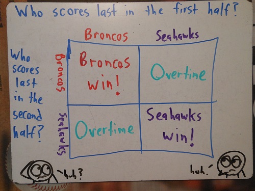 Let’s say the Seahawks kick off. The Broncos start with the ball, and commit a safety on the first play of the game. (Hey—this sounds familiar!) Now, the Broncos are forced to kick the ball to the Seahawks, who score a safety of their own. The ball goes back and forth, the teams exchanging safeties for the entire half. When the dust settles, either they’ll be tied, or the Broncos (who started with the ball) will have scored one extra safety.