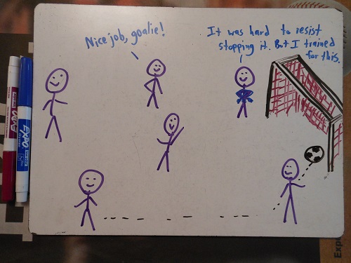 Of course, after orange slices at halftime, it’s the opponent’s turn. Starting with the ball, they’ve got 45 minutes to score as many own-goals as they can.