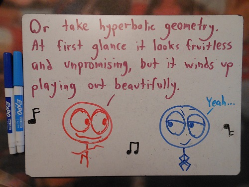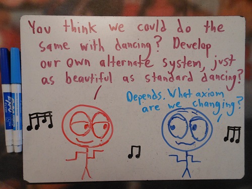 Mmm. Maybe projective geometry will help create a mathematical model of my dancing motions, too, because the Euclidean model rarely suffices. Reply