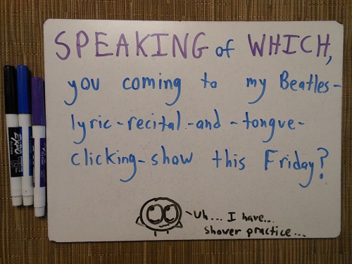 1. Thanks for this excellent post! I’d love to attend your Beatles-lyric… show on Friday. Hopefully you can come to my reading-while-knitting-and-eating-cookies pageant on Saturday!