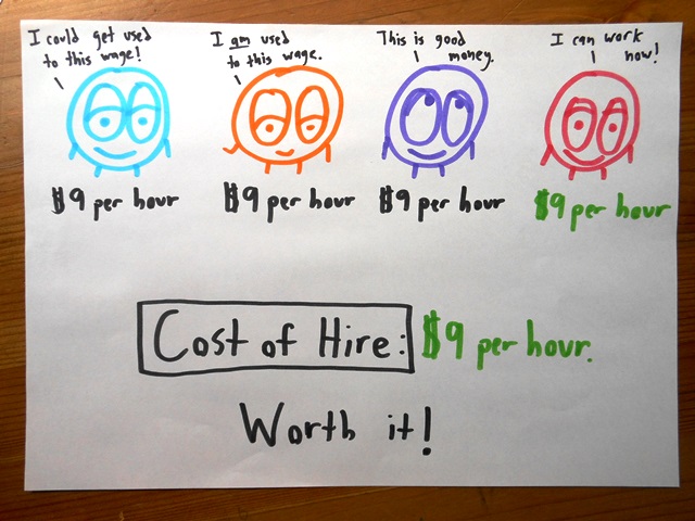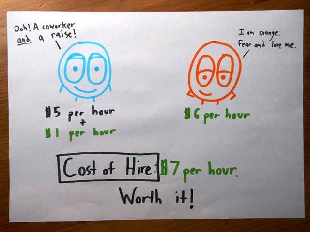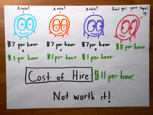 Biff is willing to work for $6/hour. McDonald’s would like to hire him, but if they do, they’ll have to raise Anita’s wage too. (They can’t pay a new hire more than an experienced veteran!) So hiring Biff really costs them $6/hour, plus the $1/hour raise for Anita. That’s a total of $7/hour, which is still worth it, so they hire Biff.