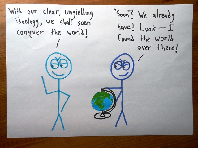 Not to get too political, but let’s take the Tea Party. My problem isn’t necessarily that I disagree with their small-government principles. It’s that they fling those principles outward like a javelin, into a reality they haven’t full investigated. Let’s deregulate the economy! Let’s revive nullification as a doctrine! Let’s default on the national debt! And let’s do this all with utter conviction, never mind that no one can possibly know for certain what will come from any of these untested policies!