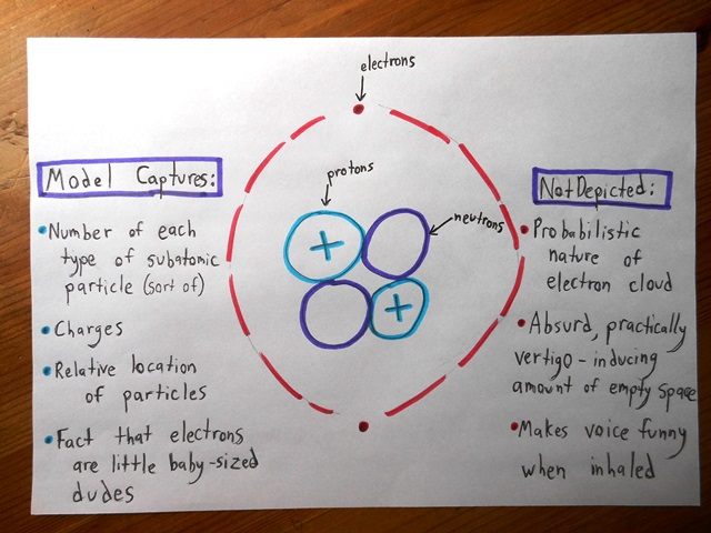 A model is a simplified representation of reality. A helium atom is reality, but this little picture is a model, because it captures some key features while leaving out others.