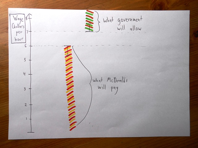 Again, Diego is willing to work for $8. And McDonald’s is willing to hire him for $8. But it doesn’t happen—not because of government interference, but because of the structure of the labor market itself.