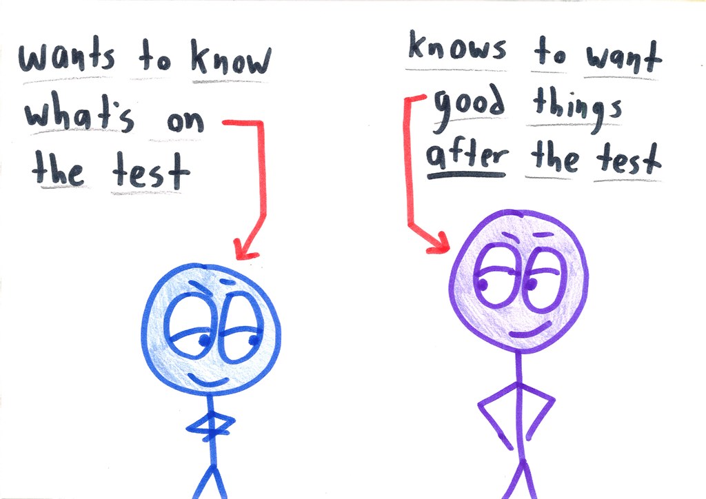 And as for our tests—no matter how well-intentioned, no matter how clever and fair, there will always be a back-road to the right answer. There will be something to memorize—a procedure, a set of buzzwords, whatever—that will function as a fake ID, a convincing charade of understanding.