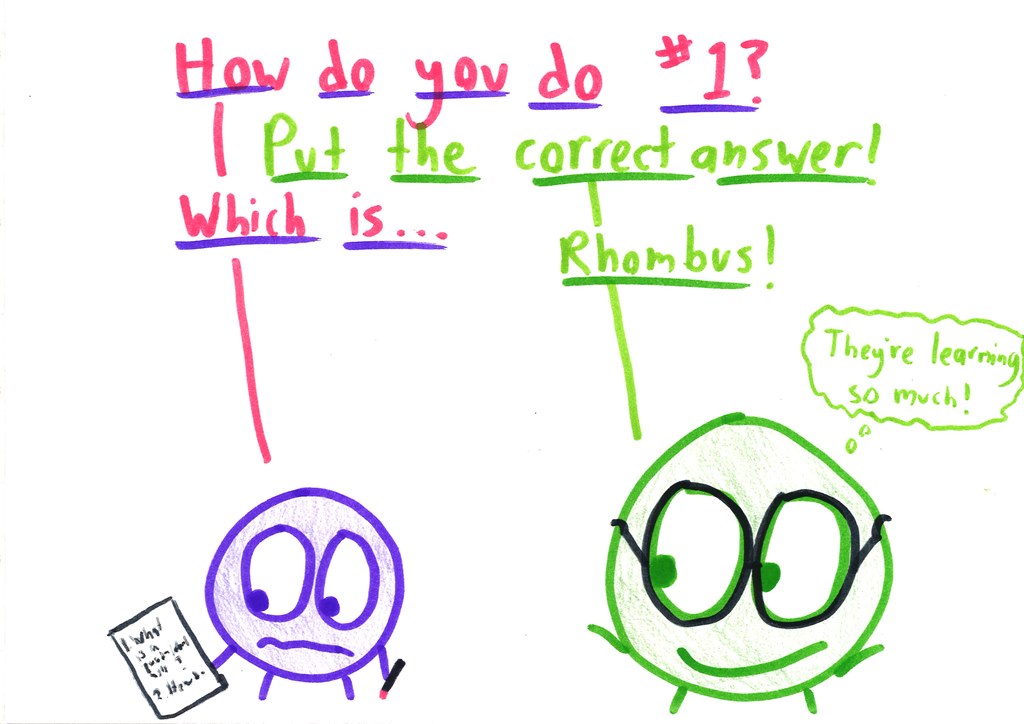 But sometimes, I still slip up. I think my students are learning deep concepts and strategies, but they’re only parroting phrases or mimicking procedures. Too late, I realize what’s happening… but by then the suitable questions are used up. They can answer without understanding. And it’s back to the drawing board for me.