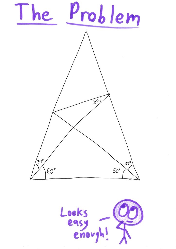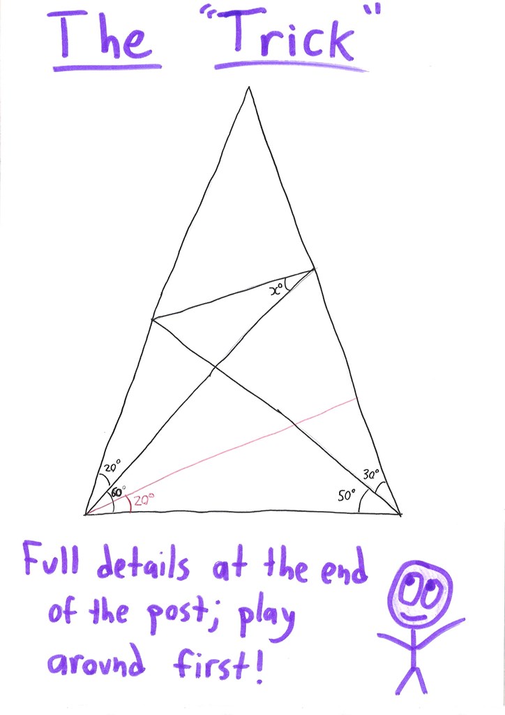 So I spent two hours half asleep from the crack of dawn on this, with the hint line. I did see the original triangle and two more triangles as isosceles, and then an equilateral triangle appeared. i returned after a nap, two or three more isosceles triangles popped up, one of which had the looked for angle – so damn simple, in the end! The “trick” line is not a trick, it is a result of seeing that the problem is about isosceles triangles. I agree with Rene Grothman.