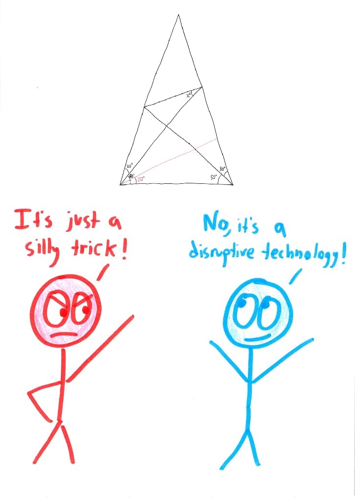 In February, I was throwing together a geometry test for my 12-year-olds. I wanted a standard angle-chasing problem, but – and here’s the trick – I’m lazy. So I grabbed a Google image result, checked that I could do it in my head, and pasted it into the document.