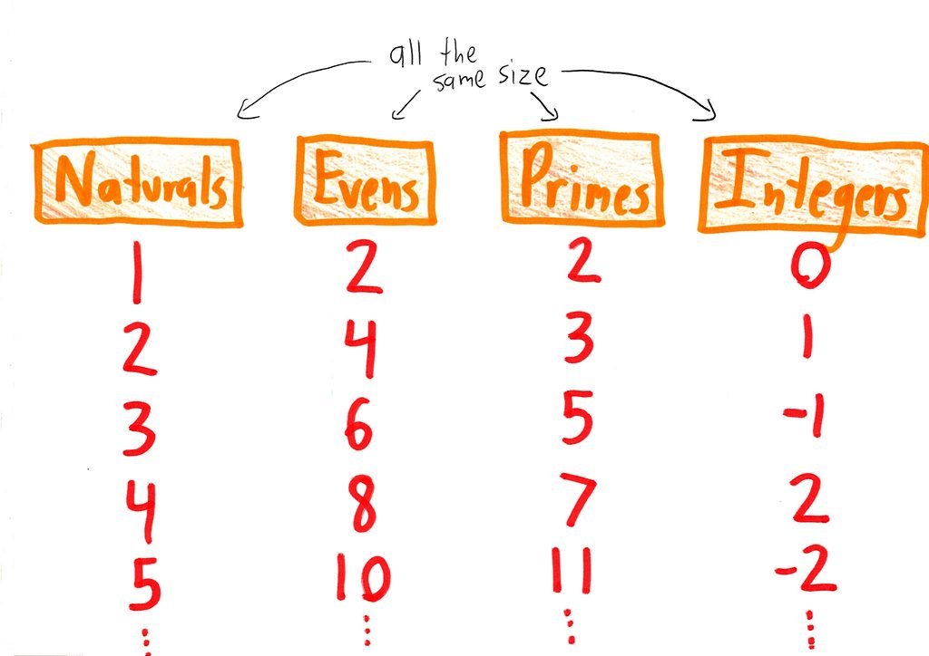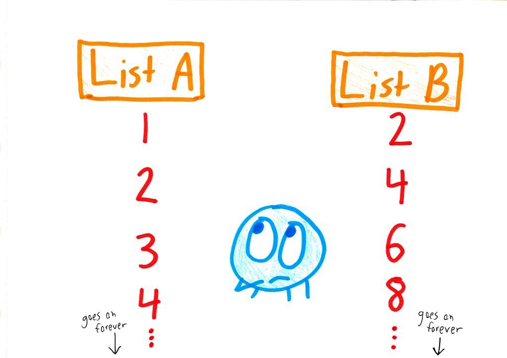 Well, they’re both continue forever, so they’re both infinite. But the first list includes every number on the second (2, 4, 6, 8…), and lots more as well (1, 3, 5, 7…). Thus, clearly, List A is the bigger group of numbers. Right?