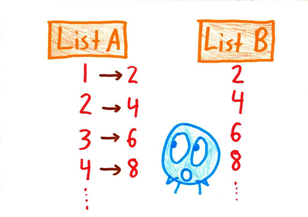 Now, doubling each number shouldn’t affect the size of the list. We haven’t added any items, or taken any way. It’s like taking a group of people and giving them fake beards—you don’t create or destroy any humans in the process.