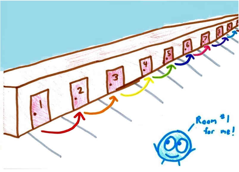 It’s true. The person in Room 1 goes to Room 2. The person in Room 2 goes to Room 3. The person in Room 136,004 goes to Room 136,005. And so on. Everybody has someplace to go.