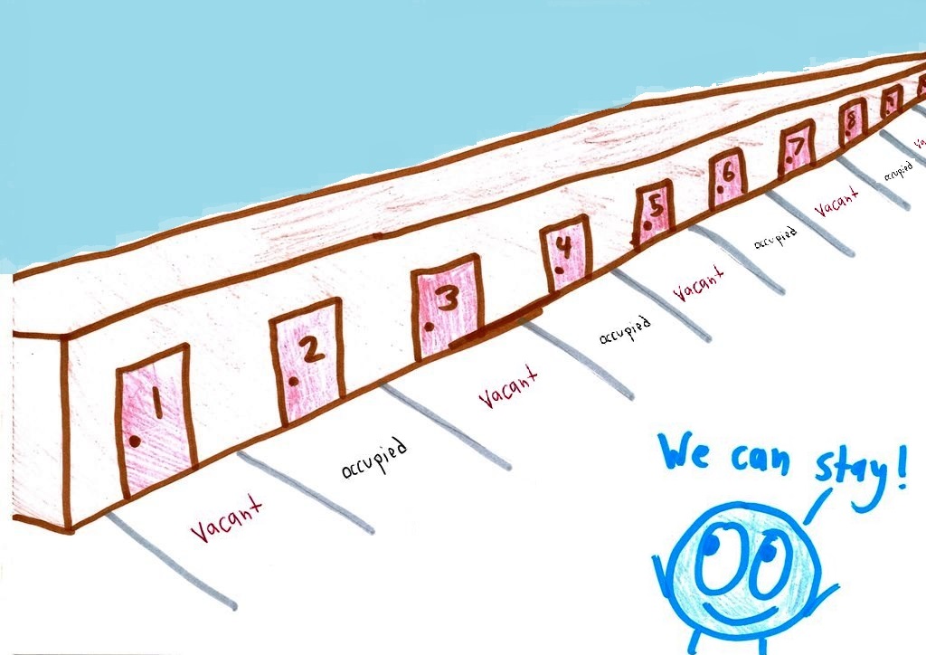 Can we do this without inconveniencing an infinite number of people? Unfortunately, no. For example, if you take Room 1, and send that guy packing, he’s going to have the same problem as you: every room is now occupied. As long as you’re shuffling a finite number of rooms, normal math applies, and somebody will be left out. Your infinite problem demands an infinite solution.