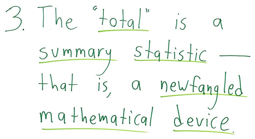 Although it’s often used as a synonym for “number,” the word “statistic” in fact has a specific and little-discussed meaning. It refers to a single number that summarizes a whole sample. For example, if I grab five people off the street, ask them how annoyed they are (on a 1-to-10 scale) at being grabbed by me, and then average those numbers, that average is a statistic.