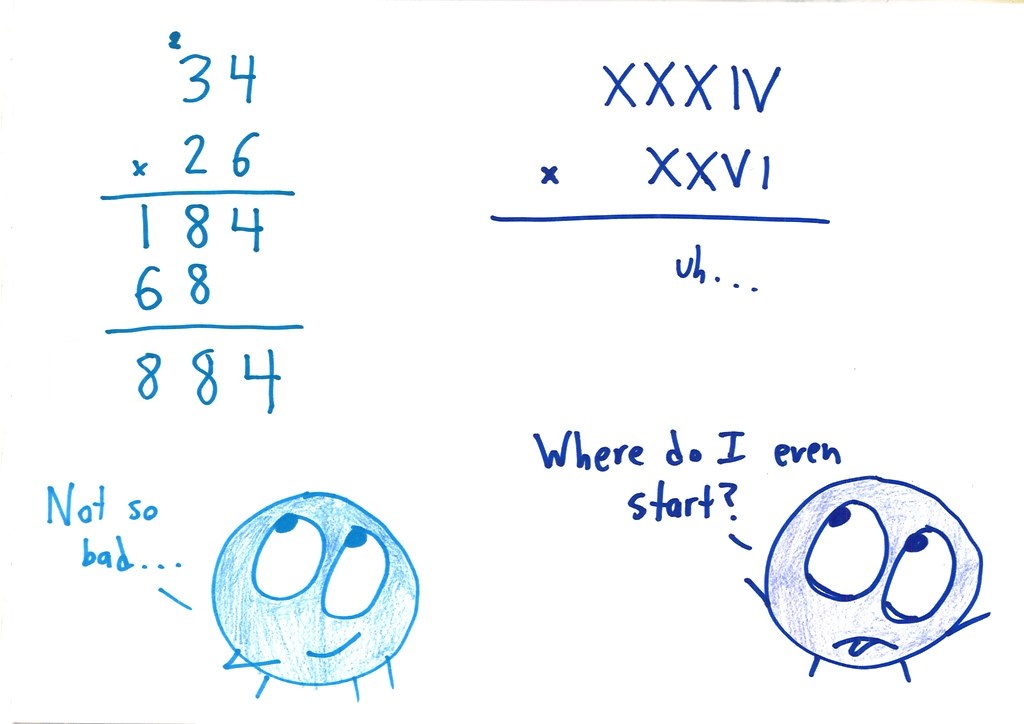 is kind of not true. it’s true that it’s harder to use roman numerals with our modern paper algorithms, but romans didn’t use paper algorithms. They used counting boards (basically an abacus). And while roman numerals are not good for symbolic manipulation, they’re great as records of abacus bead locations. That’s why roman numerals used both iiii and iv for the number 4. iiii refers to 4 stones in the one’s place, while iv refers to the act of adding 4 but subtracting a 1 stone and adding a 5 stone.