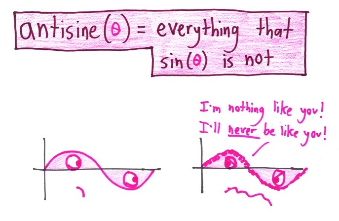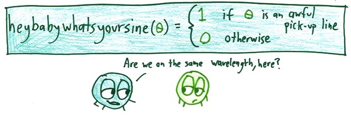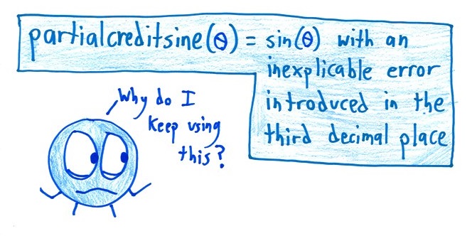There’s only one trig function! cos(theta) = sin(theta+pi/2). For some reason the intro physics book I teach from switches from one to another while talking about waves, even though there’s a phase already in the definition of a sinusoidal wave. Students who think they’re different functions are perplexed. Sigh.