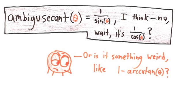 ambigusecant(Θ) = 0.5 * ( sec(Θ) + csc(Θ) + improvisine(Θ) * (sec(Θ) – csc(Θ)) )
