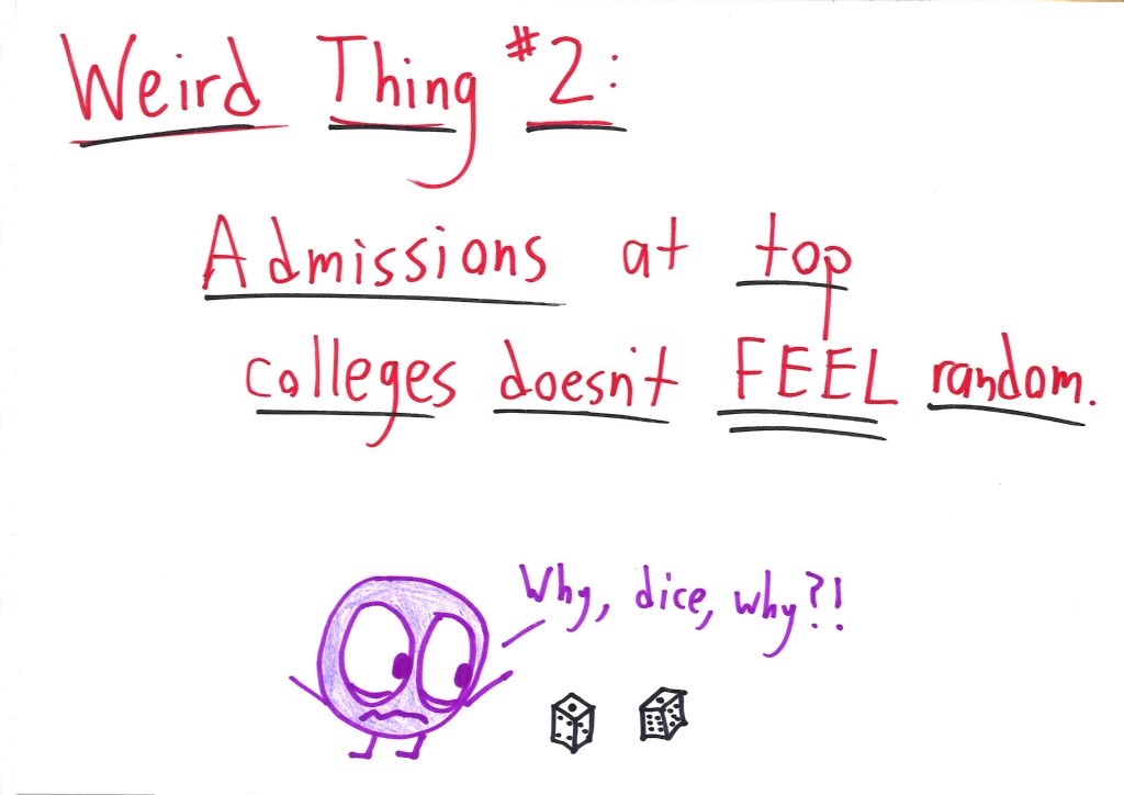 This pair of weird things–that the process is deeply random among those who qualify, but doesn’t feel like it–does a very good job of both explaining and dismissing the standard “White Whine” about affirmative action: I didn’t get in because some ____ took my place. It’s easy to understand why getting left at the altar makes some people look around for someone to blame; and it’s equally to see that in an essentially random process there really *isn’t* anyone to blame.
