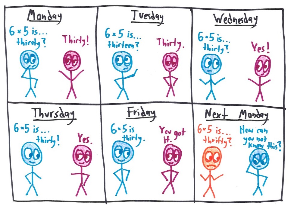 12. Check out some works by Maria Montessori. She explains the child’s innate desire to practice until satisfaction is reached. Also, when people actively create their own mathematical knowledge in the context of real world situations, they are going to understand and “know” it. It is not true that the only paradigm is “learn (ie be taught) the concepts and then repeat them.” You can repeat, experiments, manipulate, and in that way discover and learn the concepts for yourself…. the same way mathematical formulas and theories were discovered in the first place. This takes a lot more work on the teacher’s part, to set up the experiments and the activities with the right amount of guidance to reach the desired conclusions. There are some curriculum that do a better job of this than others, too. It is also generally not how we’re “taught” to teach mathematics in our education prep courses.