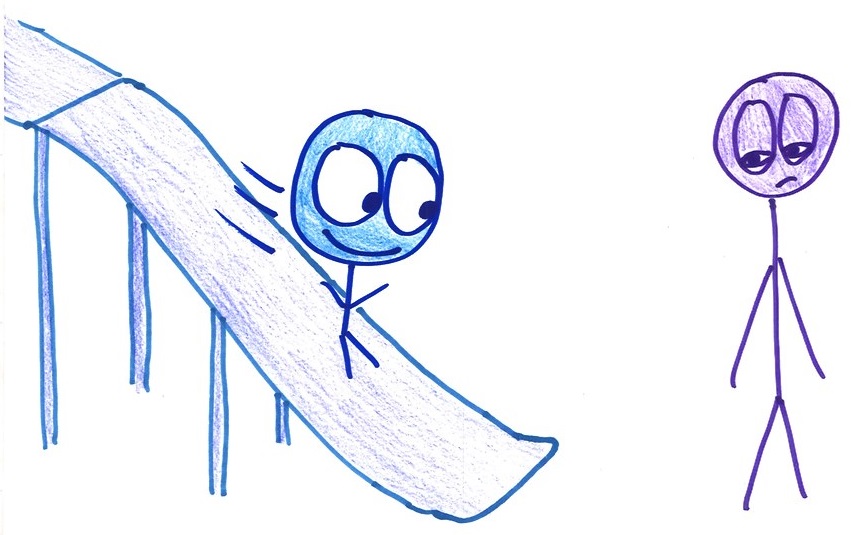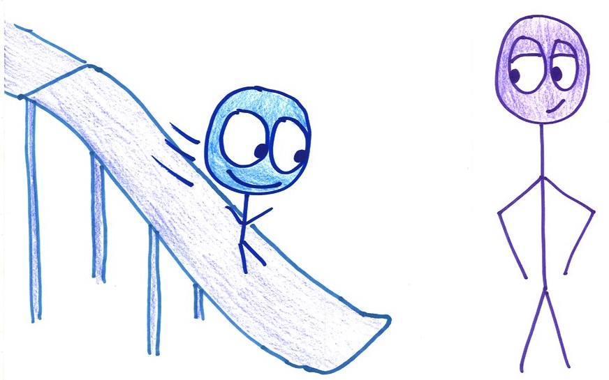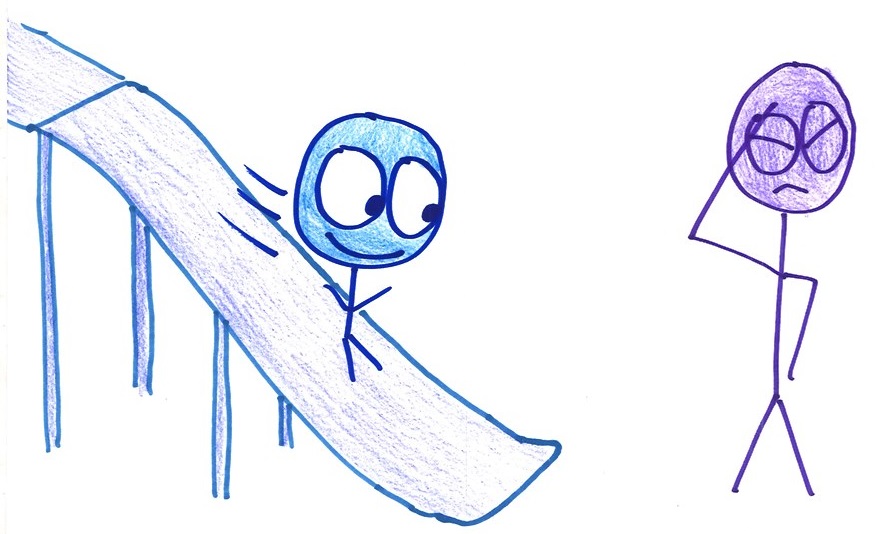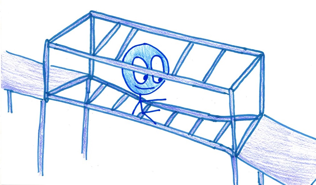 Okay, fine, no change there. What surprised me wasn’t the down, but the up. Instead of the usual steps, Leo sought out a ladder on the opposite side of the structure. From there, he could reach the slide only by crawling through a sort of cage-tunnel, full of wide gaps, through which his whole body could easily fall.