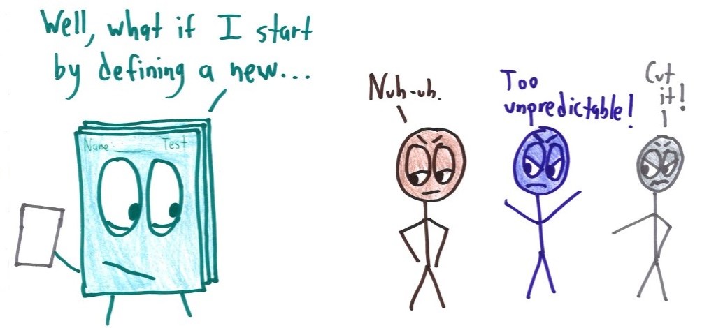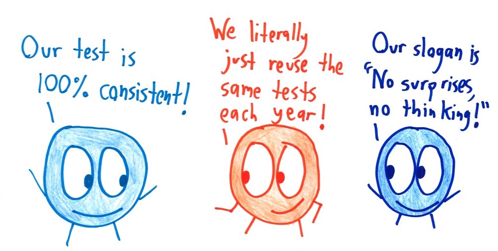 We want our tests to be consistent. So we stop asking questions with any degree of novelty or surprise.