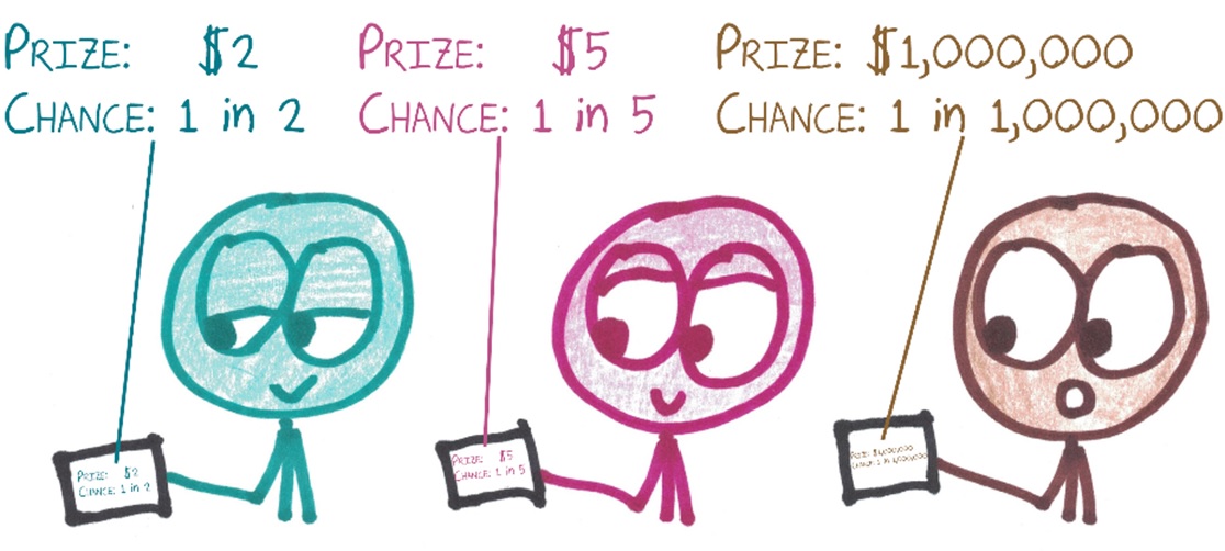 Also, I’d probably be a small adventure seeker- anything greater than 1 in 1000 chance seems so unlikely that I wouldn’t even think about winning. Maybe 200 dollars would be a good amount to win without being ludicrous- I could treat myself but it’s not never going to happen.