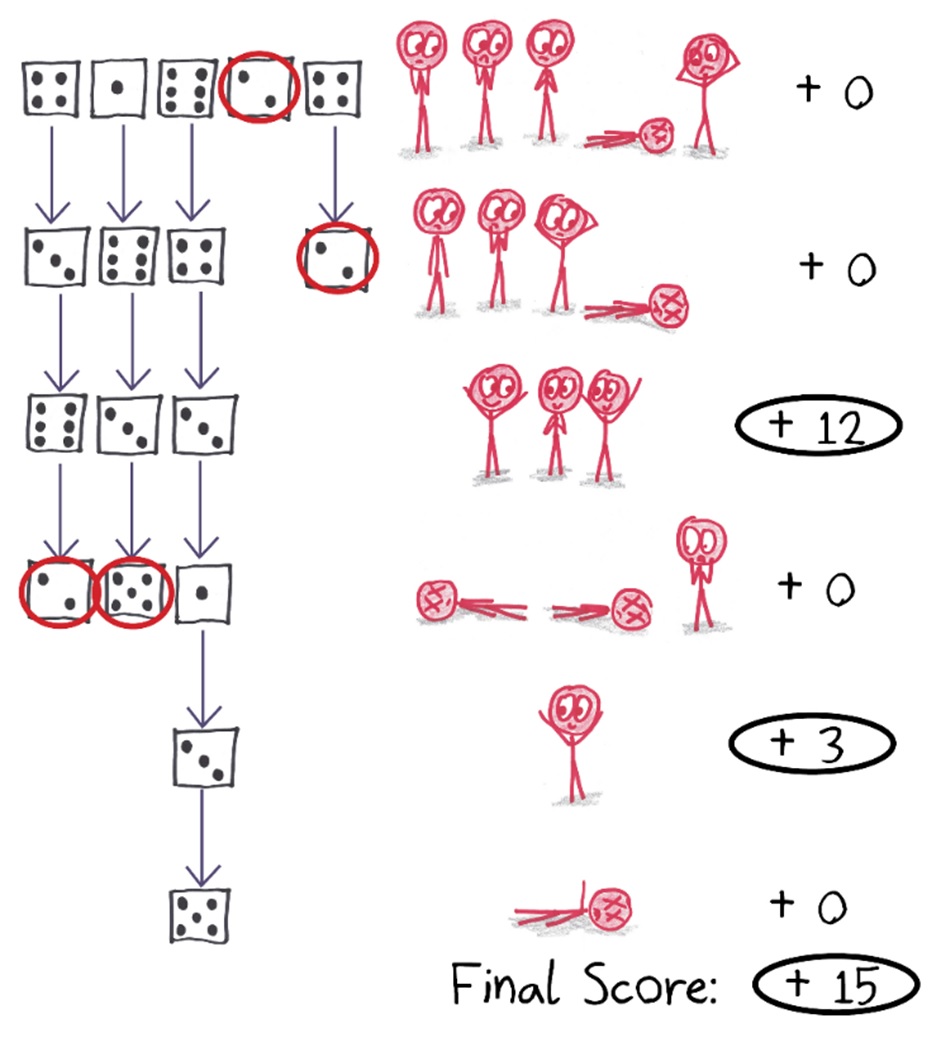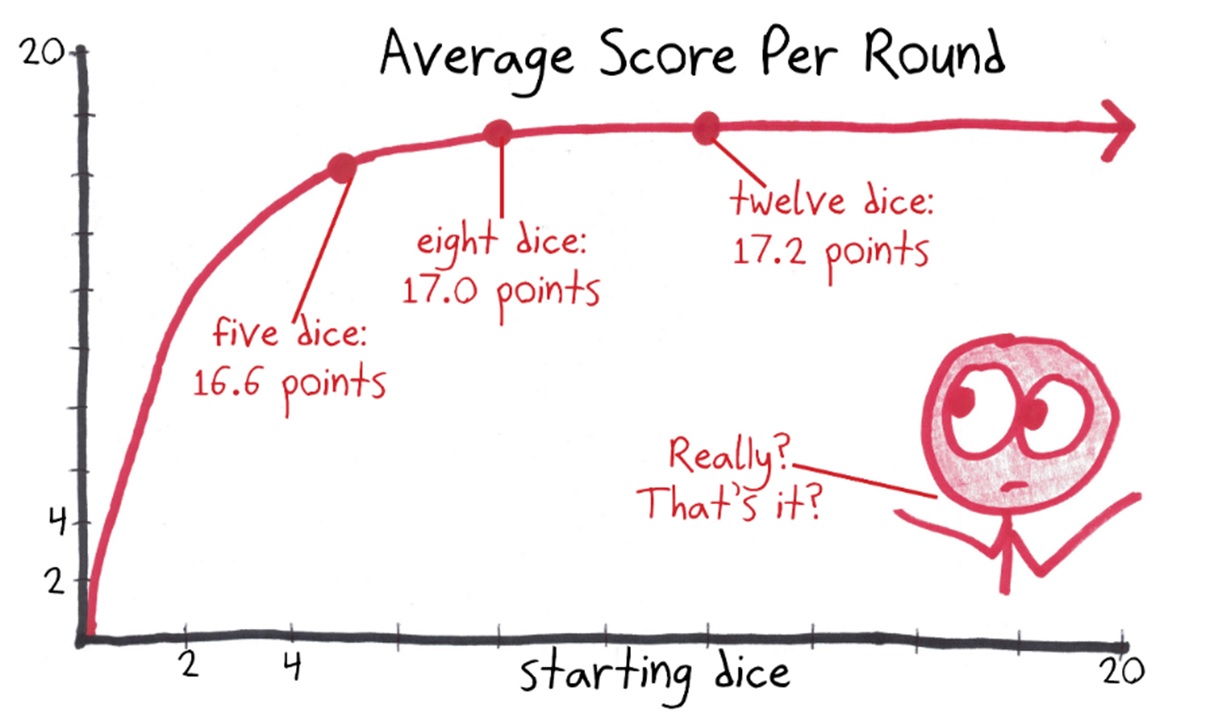 Let’s say you begin with 5 quadrillion dice, enough to blanket the state of West Virginia. Seems like you should score tons of points, right? Nope. Roll after roll, about 1/3 of your dice will spoil the party. This will repeat a hundred times in succession, your score stuck on zero, until finally, with just a few dice remaining, you begin to score points. (About 17 points, on average.)