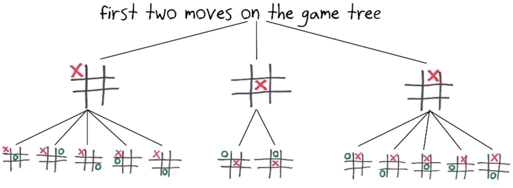 Second, you might give the size of the game tree: the number of different sequences of moves that can unfold from the first turn to the last. (Since most board scenarios appear multiple times on the game tree, this is much larger than the state space.)