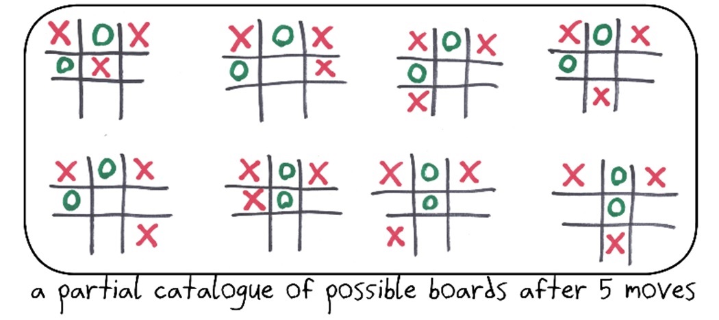 Mathematically, there are two basic ways to answer. First, you might give the size of the state space: the number of possible arrangements of pieces that can arise during gameplay. In tic-tac-toe, for example, we envision every possible board scenario, and count them up.