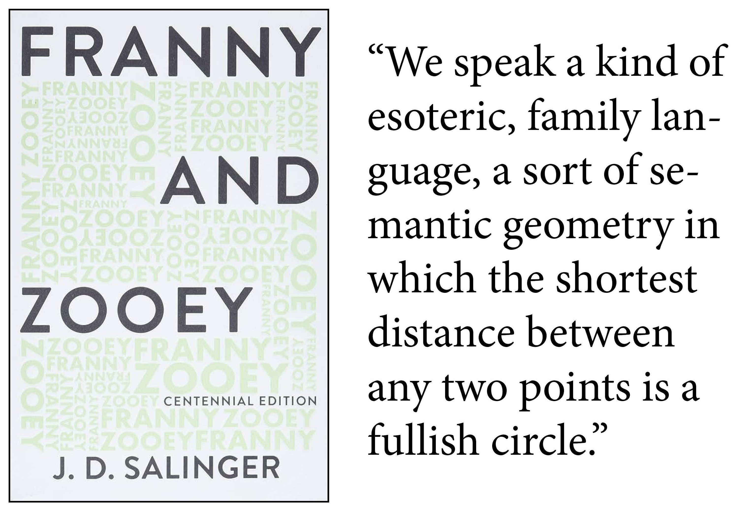 "We speak a kind of esoteric, family language, a sort of semantic geometry in which the shortest distance between any two points is a fullish circle." -J.D. Salinger, Franny and Zooey