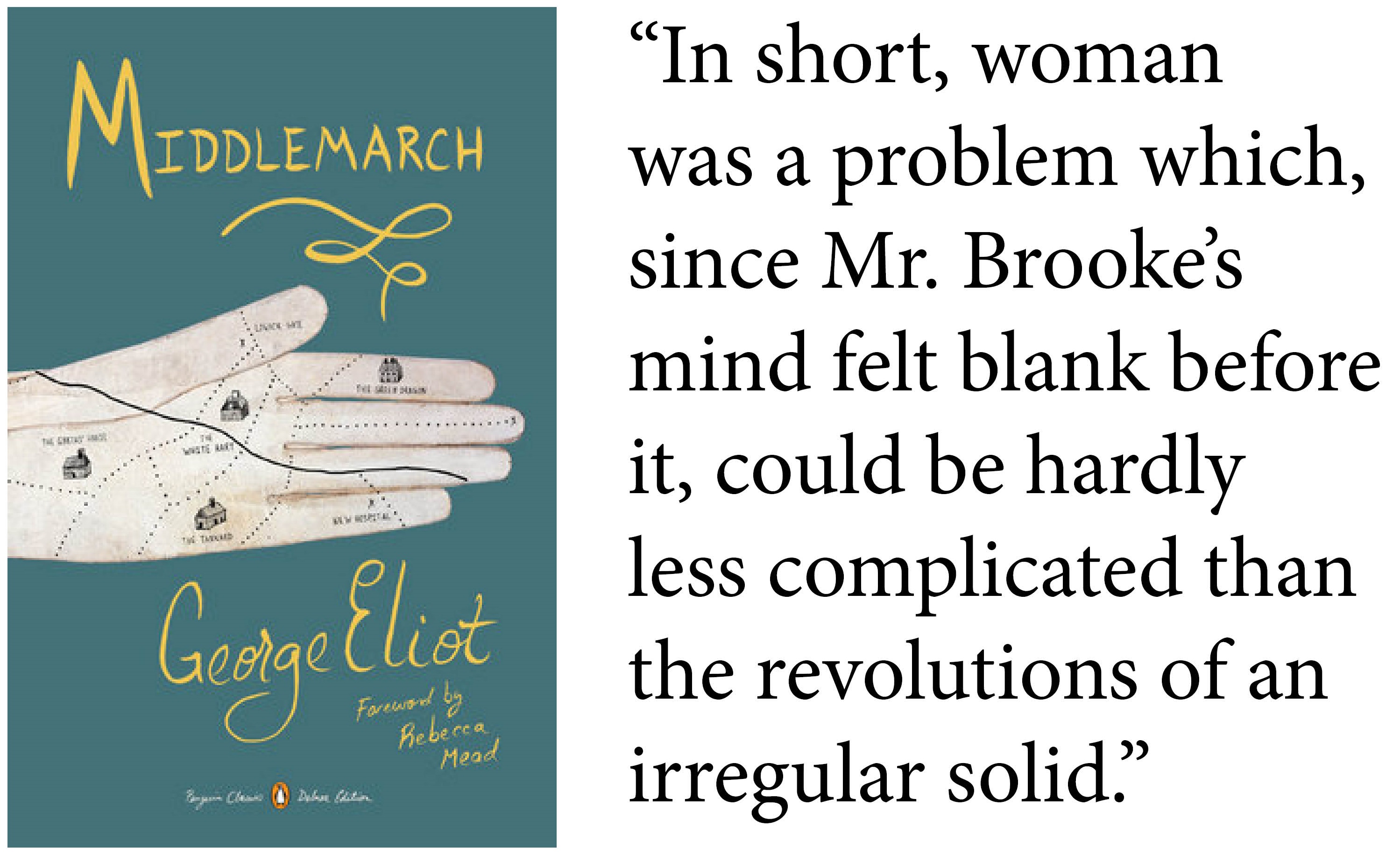 "In short, woman was a problem which, since Mr. Brooke's mind felt blank before it, could be hardly less complicated than the revolutions of an irregular solid." -George Eliot, Middlemarch
