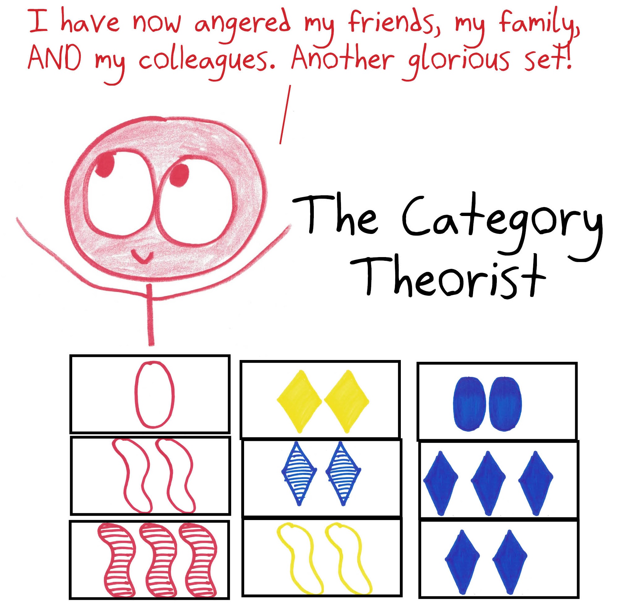 Category Theorist: See, here’s a set that fails because of the textures. Here’s a set that fails because of the colors. Here’s a set that fails because of the numbers. And all three of them fail because of the shapes.