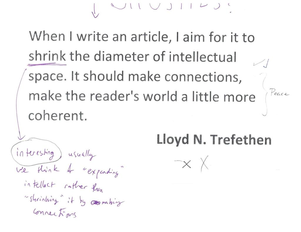 One particular rising star was Nick Trefethen, a numerical analyst whose book of index-card musings I’d recently enjoyed, and from which I’d farmed a few favorite comments.