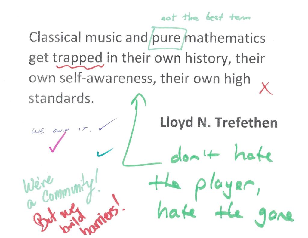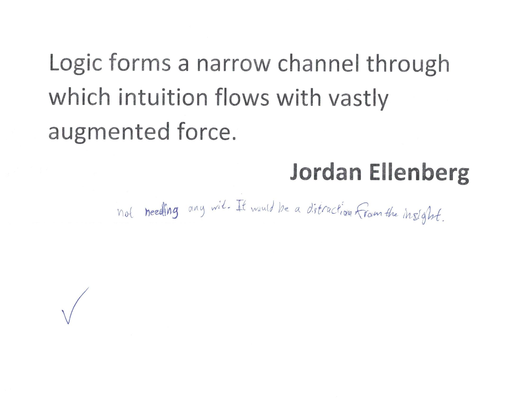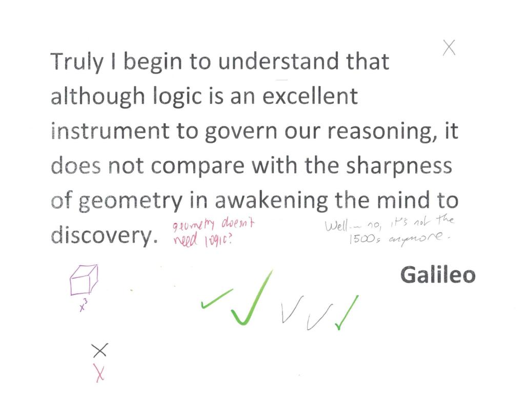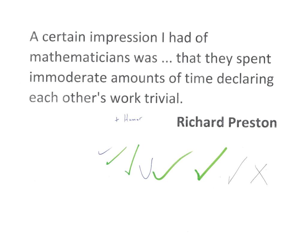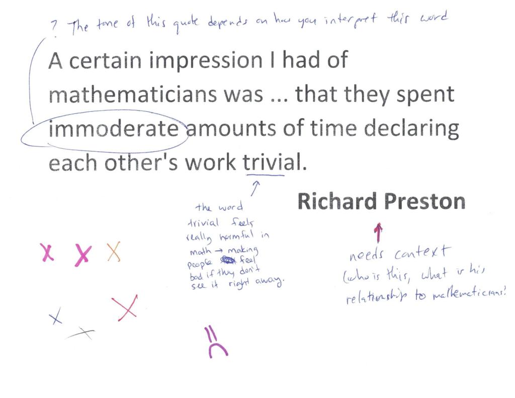 They voiced approval (✔) and disapproval (X). They agreed and disagreed. They annotated and arranged. And, I hope, they assembled the raw material for speaking what has too long remained unspoken. I hope that they found quotations able to name and crystallize some of those unnamed vapors without which we’d be unable to breathe mathematics at all.