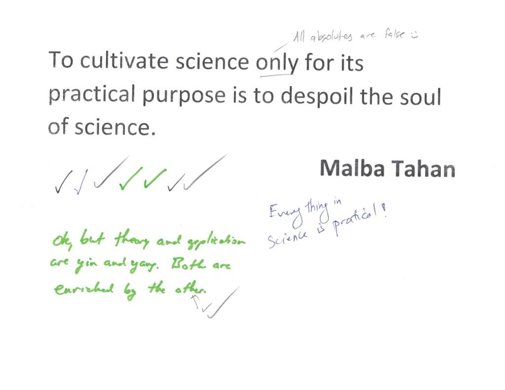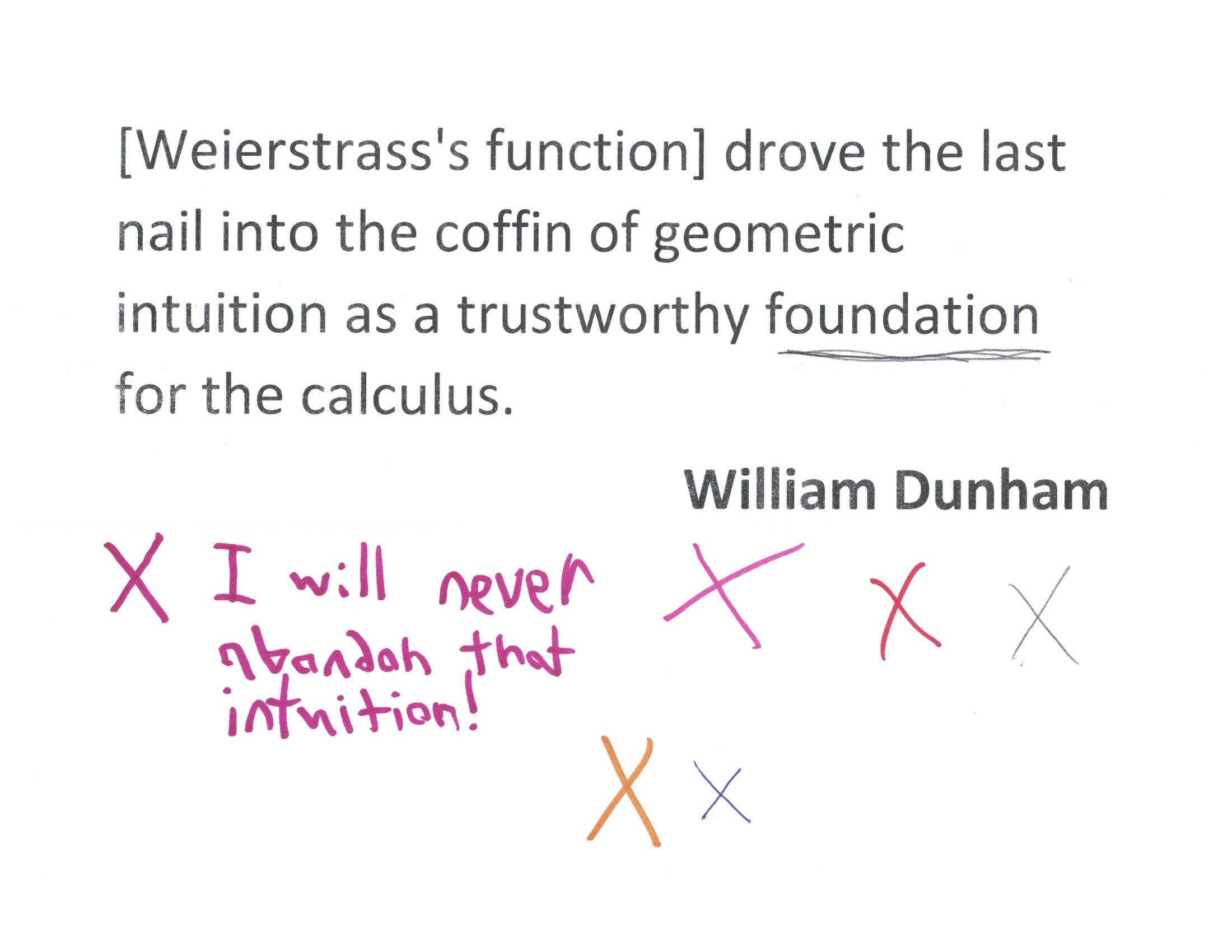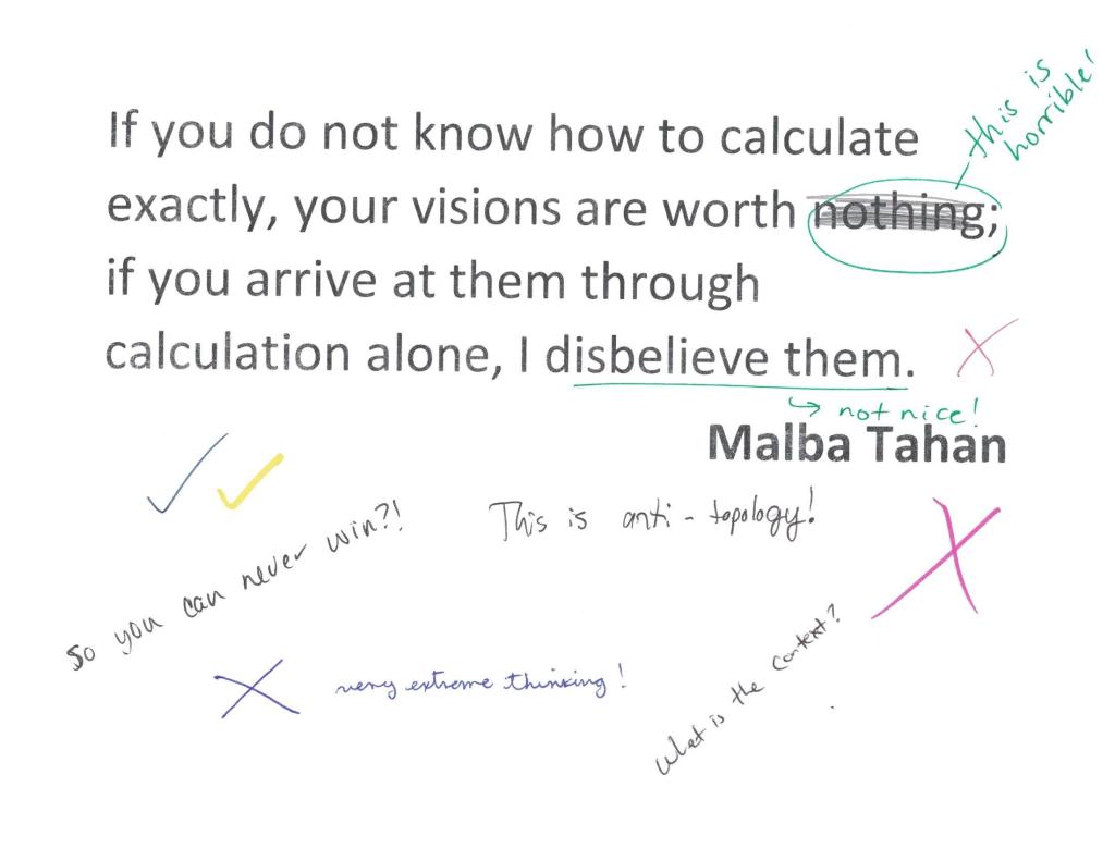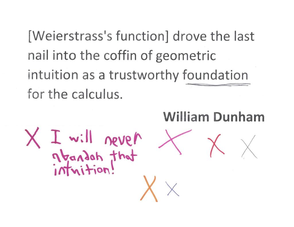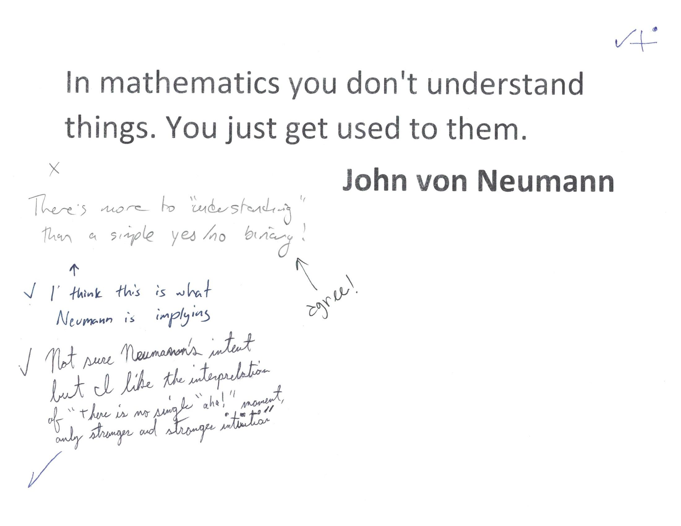 They voiced approval (✔) and disapproval (X). They agreed and disagreed. They annotated and arranged. And, I hope, they assembled the raw material for speaking what has too long remained unspoken. I hope that they found quotations able to name and crystallize some of those unnamed vapors without which we’d be unable to breathe mathematics at all.