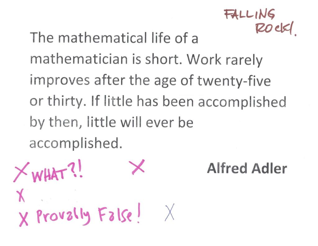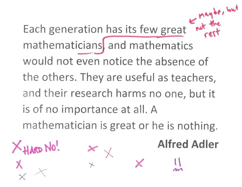 Some quotes stood out as particularly controversial–or not even controversial, just universally reviled, like Alfred Adler’s venomous assessments of mathematical research careers.