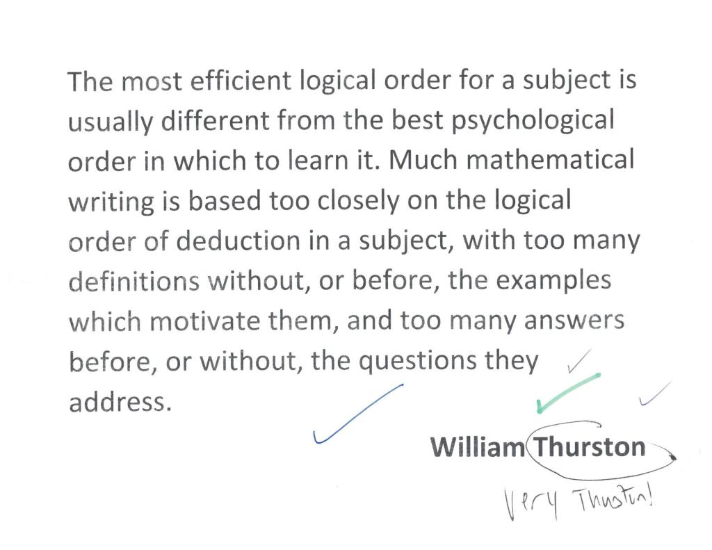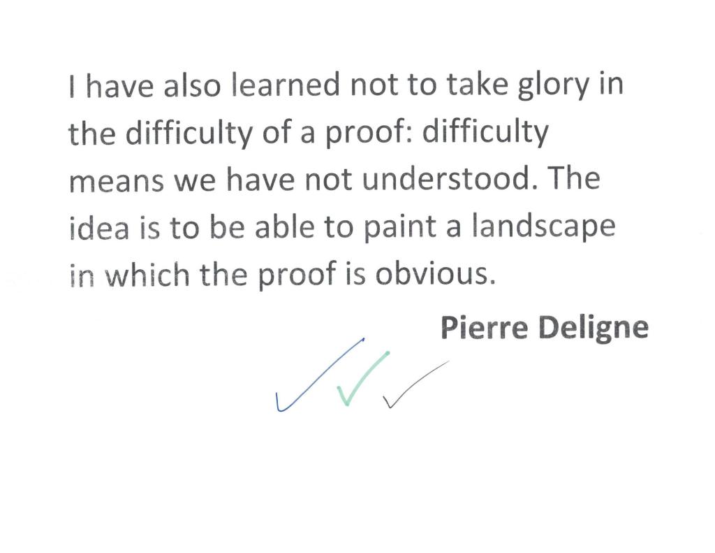 “In the remaining sections of this paper we briefly discuss various occurrences of the stability and pinching phenomena in differential geometry. The results we present are, for the most part, not new and we do not provide the detailed proofs. (These can be found in the papers cited in our list of references). What may be new and interesting for non-experts is an exposition of the stability/pinching philosophy which lies behind the basic results and methods in the field and which is very rarely (if ever) presented in print. (This common and unfortunate fact of the lack of an adequate presentation of basic ideas and motivations of almost any mathematical theory is, probably, due to the binary nature of mathematical perception: either you have no inkling of an idea or, once you have understood it, this very idea appears so embarrassingly obvious that you feel reluctant to say it aloud; moreover, once your mind switches from the state of darkness to the light, all memory of the dark state is erased and it becomes impossible to conceive the existence of another mind for which [the] idea appears non-obvious.)” –Mikhail Gromov, “Stability and Pinching” pp. 64-65.