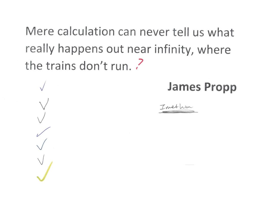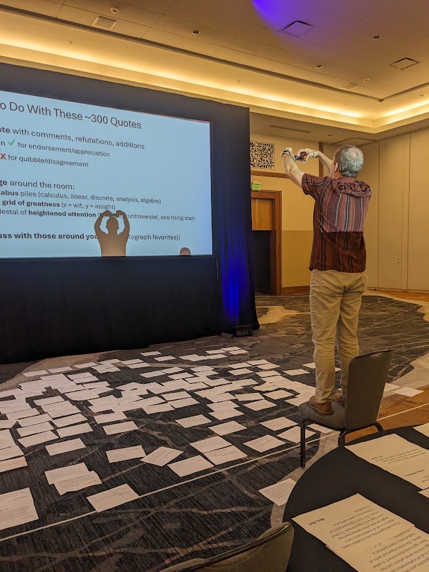 A few days ago, at MathFest 2024 in Indianapolis, I ran a session titled Quotable Mathematics. Over a hundred mathematicians gathered in a ballroom; I pointed them towards a pile of pens and a stack of some 300 quotations; then I said, in so many words, “go to town.”