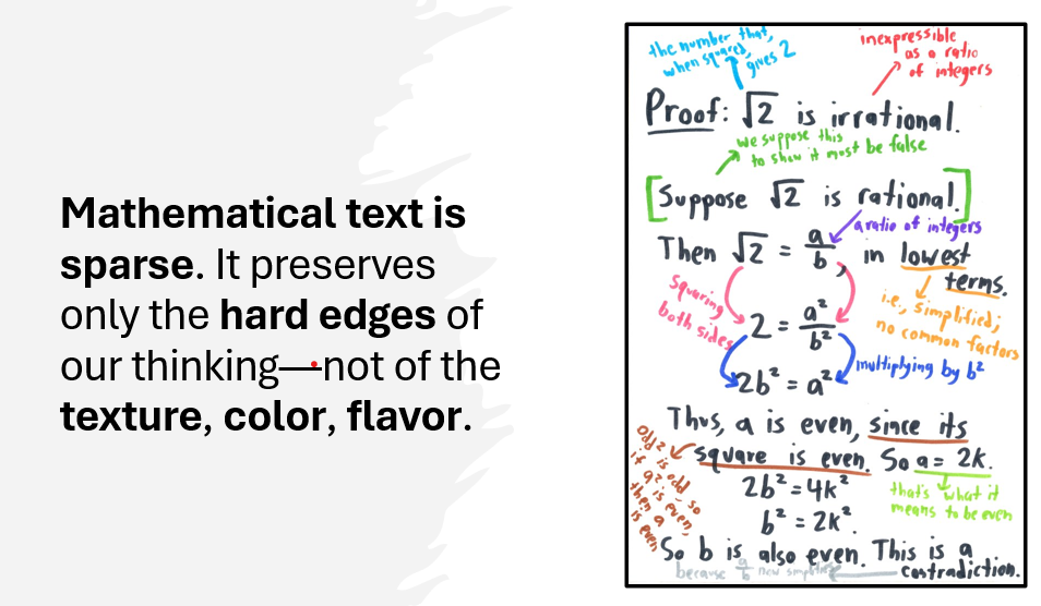 But mathematical writing is like a stone monument from a lost civilization. Opaque. Mystifying. Mathematical texts loom like obelisks in the desert, their meanings hard to trace, their origins almost impossible to imagine.