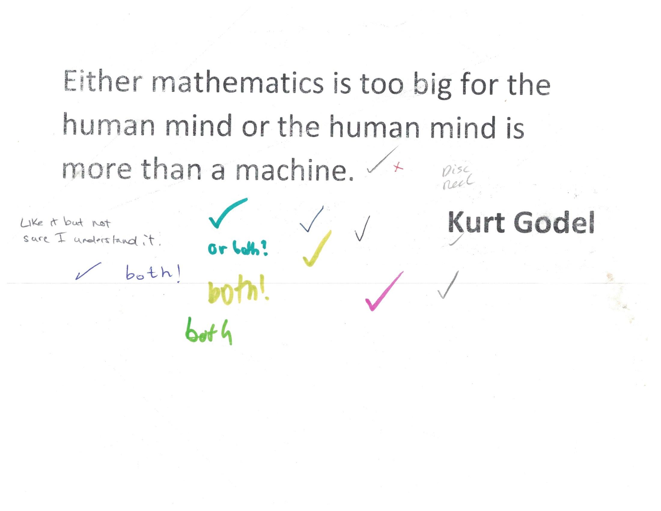 I enjoyed the conversations arising from this line. (The point, I think, is that the incompleteness theorems mean that mechanistic processes can never encompass all of mathematical truth — so any mental process that can do so must be more than simply mechanistic.)